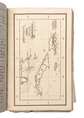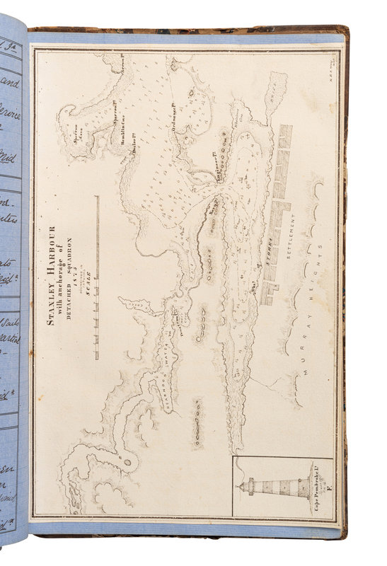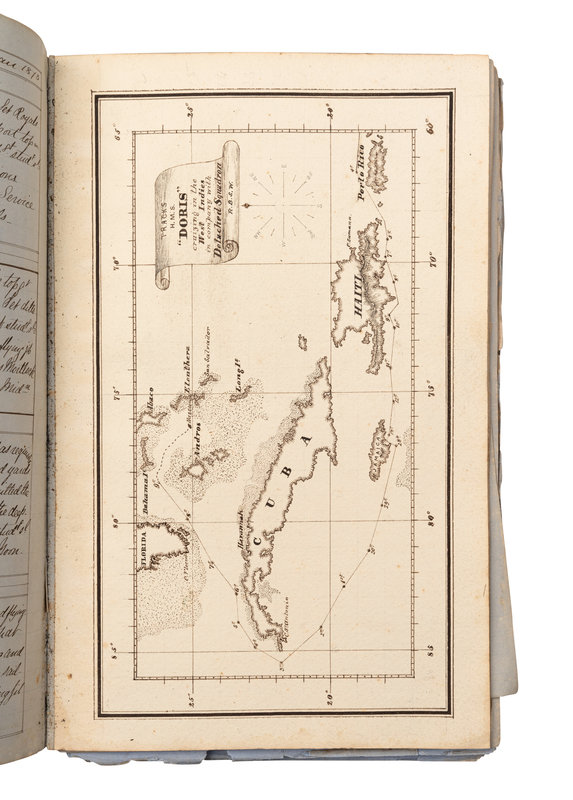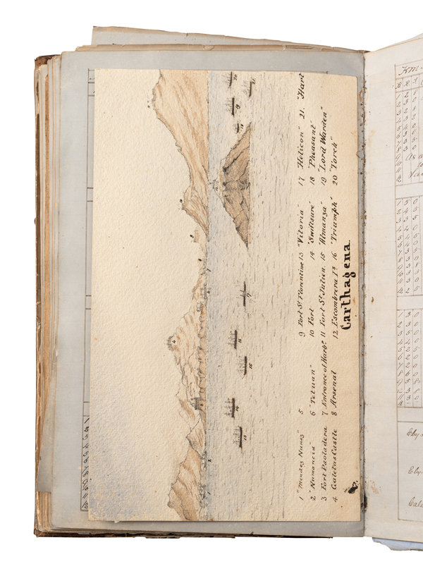 Approximately 500 pages bound in one volume, folio (ca 307 x 205mm). Written in cursive in brown ink on blue paper. With inserted plates in pen-and-ink (most on heavy paper), including 4 decorative title-pages (2 with watercolor), 18 maps or charts (some folding), 4 ship diagrams (one with watercolor), and one watercolor view of Carthagena. (Some leaves frayed or brittle at edges, possibly missing leaves, one folding map separated into pieces, some staining, usual dust-staining and signs of wear.) Bound in contemporary half calf (rubbed and worn, text block cracked with many quires or leaves becoming loose). Provenance: Juha Nurminen (bookplate).