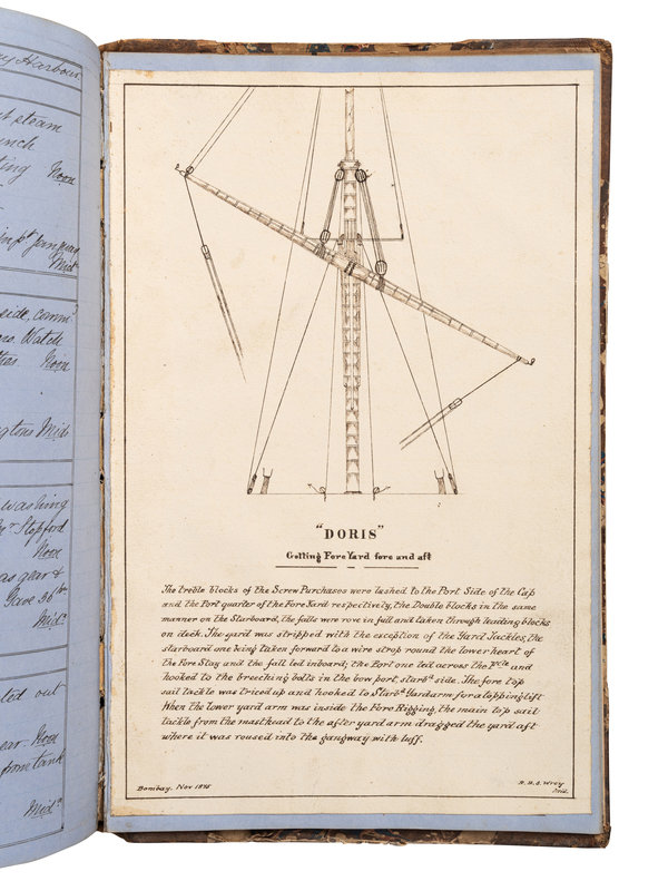 Bound volume of logbooks kept by Midshipman R. Wrey serving briefly (July to August 1870) on HMS Wellington (then a training ship at Portsmouth Harbour); from 11 December 1871 on HMS Inconstant, sailing from Madeira to Rio, then to the Cape, Simon's Bay, Bombay, Mauritius, Simon's Bay, St Helena, Ascension Island, Fayal, returning to Portsmouth on 11 October 1872; the remaining sequence of logs recording service on HMS Doris between 16 October 1872 and 17 January 1876, cruising off the coast of Spain, from Funchal to Barbados, in the West Indies, from Halifax to Gibraltar and Gibraltar to Halifax, off the Cape de Gatte, in the Mediterranean, from Malta to Corfu, Navarino to Salamis, St Vincent to Monte Video via Stanley and back via the Falklands and the Cape, from Gibraltar to the Cape, and from there to India.