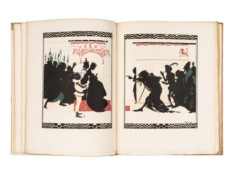 Folio. One tipped-in color plate, color frontispiece, color-illustrated title-page, 16 full-page silhouette illustrations (4 in color, 7 double-page), numerous illustrations. (Some offsetting.) Original vellum-backed gilt-stamped pictorial boards, top edge gilt, others uncut (some light wear, toning and soiling).