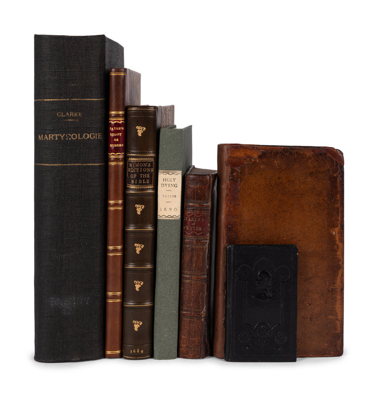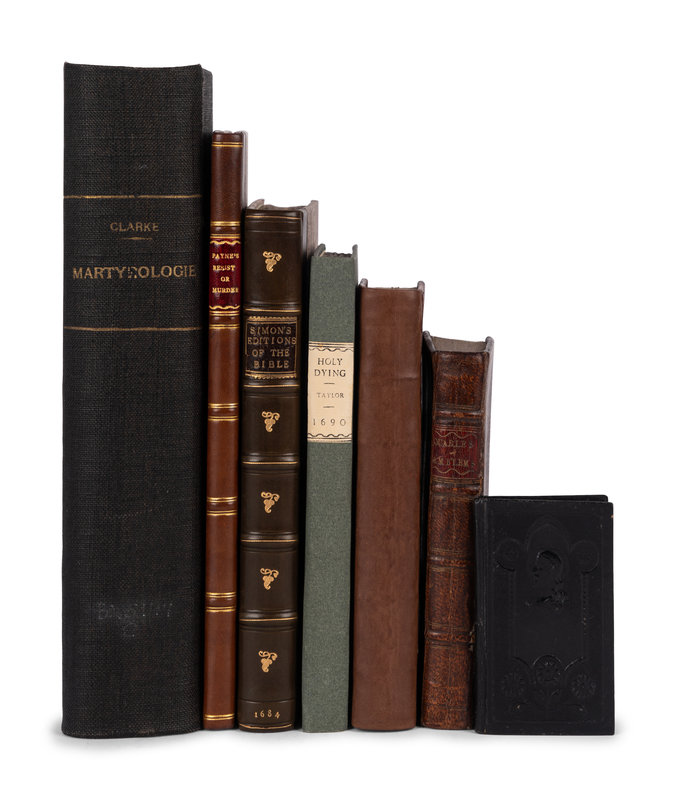 The Apocrypha. Edinburgh: A. Donaldson and J. Reid, 1763. Contemporary calf pasted over modern calf; full vellum box. Provenance: James Chapman. -- CLARKE, Samuel. A Martyrologue Containing A Collection of All the Persecutions Which Have Befallen the Church of England... London: T. Ratcliffe and E. Mottershed, 1652. Illustrated. Later black cloth. -- PAYNE, William. The Unlawfulness of Stretching Forth the Hand to Resist or Murder Princes. London: A. Grover, 1683. Modern quarter calf; full calf slipcase. Provenance: Anne Wallis. -- QUARLES, Francis. Emblems, Divine and Moral. [London]: J. Nutt, [1736]. Illustrated. Contemporary calf; folding box. -- SIMON, Richard, Father. Critical Enquiries into the Various Editions of the Bible. London: Thomas Braddyll, 1584. Modern quarter calf. -- TAYLOR, Jeremy. The Rule and Exercises of Holy Dying. London: Printed by J.L. for Luke Meredith, 1690. With fold-out engraving. Modern green cloth. -- The Devout Child. New York: The Ava Maria Press, [n.d.]. Publisher's stamped calf; slipcase. -- Together, 7 works in 7 volumes, various 4to, 8vo, and 12mo sizes, condition generally fine.