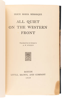 FIRST EDITION. All Quiet on the Western Front initially appeared as a serialized story in the German magazine Vossische Zeitung from November 10-December 9, 1928, and was immediately controversial amongst German war veterans for its perceived denigration of their efforts during the First World War. It was among the first so-called "degenerate books" to be publicly burned by the Nazis upon their ascension to power.