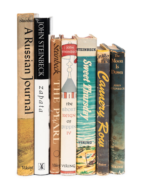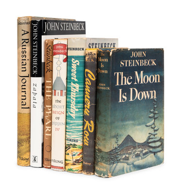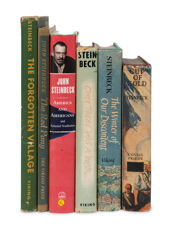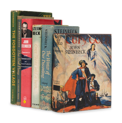 Cup of Gold. Covici Friede, [1936]. Second issue. Goldstone & Payne A1.b. -- The Winter of Our Discontent. 1961. FIRST TRADE EDITION. Goldstone & Payne A38.b. -- Once There was a War. 1958. -- The Forgotten Village. 1941. -- The Moon is Down. 1942. With added notation "By the Haddon Craftsmen" without p.112 large period. Goldstone & Payne A16.b. -- The Pearl. 1947. Goldstone & Payne A25.a. -- The Red Pony. 1945. Slipcase. FIRST ILLUSTRATED EDITION. -- A Russian Journal. 1948. 4th binding. Goldstone & Payne A27.a. -- America and Americans and Selected Nonfiction. 2002. -- And 4 others. Together, 13 works in 13 volumes, all published in New York, most by the Viking Press, all 8vo, all in original bindings, most in dust jackets, most FIRST EDITION, condition generally very good.