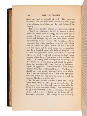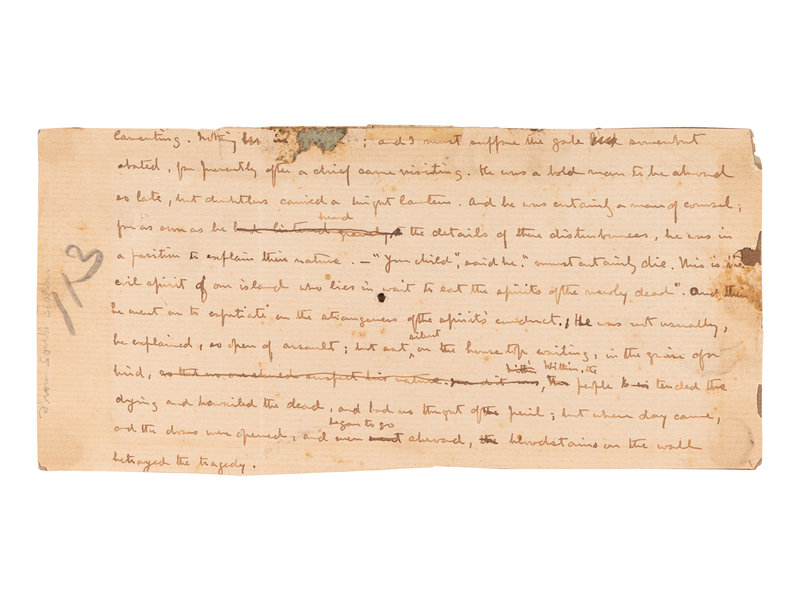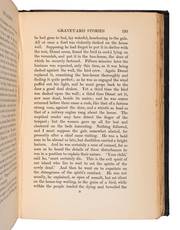 [Laid in:] STEVENSON. Autograph manuscript, a page from the manuscript of Chapter VI "Graveyard Stories" in In the South Seas (see above). One partial sheet, trimmed 4to (98 x 209 mm), containing approximately 171 words including holograph corrections and emendations, in ink, unruled. Describes, in part, the aftermath of a horrific event (published as pp. 193-194, the beginning of chapter VI “Graveyard Stories" in above copy). In part: "…lamenting. Nothing [followed]; and I must suppose the gale somewhat abated, for presently after a chief came visiting.... But when the day came and the doors were opened and men began to go abroad, blood-stains on the wall betrayed the tragedy."