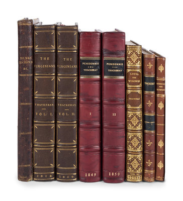 The History of Pendennis. L, 1849-1850. 2 volumes. Later maroon calf. -- The Virginians. L, 1858-1859. 2 volumes. -- Rebecca and Rowena. L, 1850. Later half calf gilt by Bayntun. -- TROLLOPE, Anthony. Thackeray. L, 1879. Later half calf. FIRST EDITION. -- Lovel the Widower. L, 1861. Contemporary green crushed levant gilt, stamp-signed by Riviere & Son; original cloth bound in. FIRST ENGLISH EDITION. -- The History of Henry Esmond. NY, 1852. FIRST AMERICAN EDITION. -- Together, 6 works in 8 volumes, various 8vo and 12mo sizes, most in contemporary half morocco or calf, most FIRST EDITIONS IN BOOK FORM, condition generally good. Provenance: one book from the collection of Henry Sayre van Duzer (bookplate), whose collection of Thackeray was sold at auction by Anderson Galleries on 6-7 February 1922.