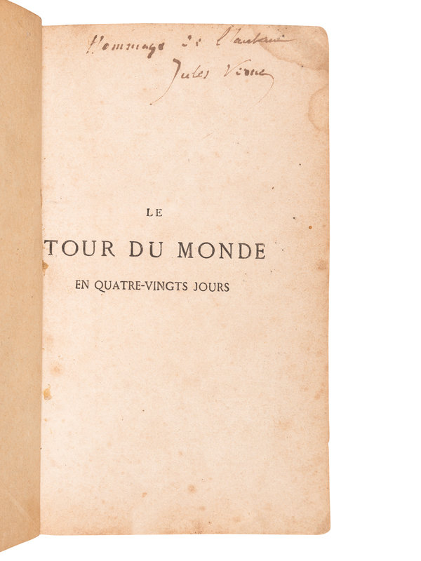 Later printing, PRESENTATION COPY, INSCRIBED BY JULES VERNE, "Hommage de Claudine." Around the World in Eighty Days was serialized in Le Temps beginning on November 6, 1872 and was published to coincide with the dates given in the text by Phineas Fogg; because of this many believed that the journey was actually taking place, with numerous bets placed on its success. The last two entries were published on December 22 - one day after Fogg announces his success.