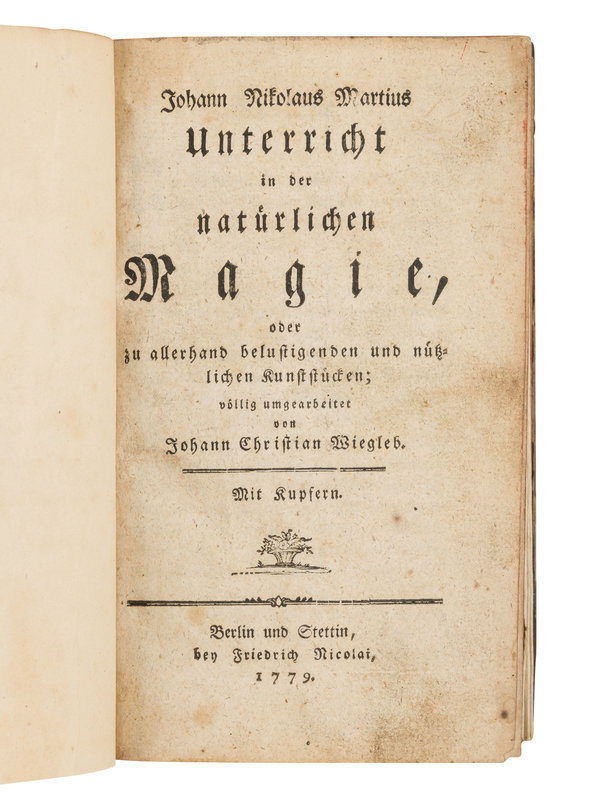 WIEGLEB, Johann Christian (1732-1800), editor. -- Johann Nikolaus MARTIUS (fl. 1779-1789). Unterricht in der Natuerlichen Magie, oder zu allerhand belustigenden und nuetzlichen Kunststuecken. Berlin & Stettin: Friedrich Nicolai, 1779.