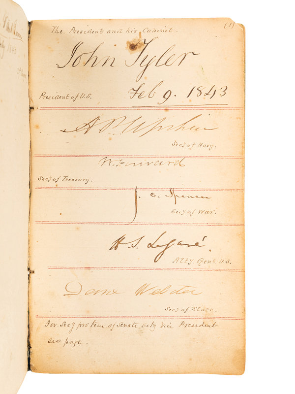 INCLUDING THE SIGNATURES OF THREE PRESIDENTS, comprising: JOHN TYLER ("John Tyler"), AS PRESIDENT, JOHN QUINCY ADAMS ("John Quincy A"), as Representative, and JAMES BUCHANAN ("James Buchanan"), as Senator. Also signed by 5 members of the President's cabinet, comprising: Abel P. Upshur, Secretary of the Navy; Walter Forward, Secretary of the treasury; John C. Spencer, Secretary of War; Hugh S. Legare, Attorney general; Daniel Webster, Secretary of State; and Willie P. Mangum, President Pro Tempore of the Senate. Also included are the signatures of approximately 227 members of the House of Representatives, 48 members of the Senate, and 2 chaplains.