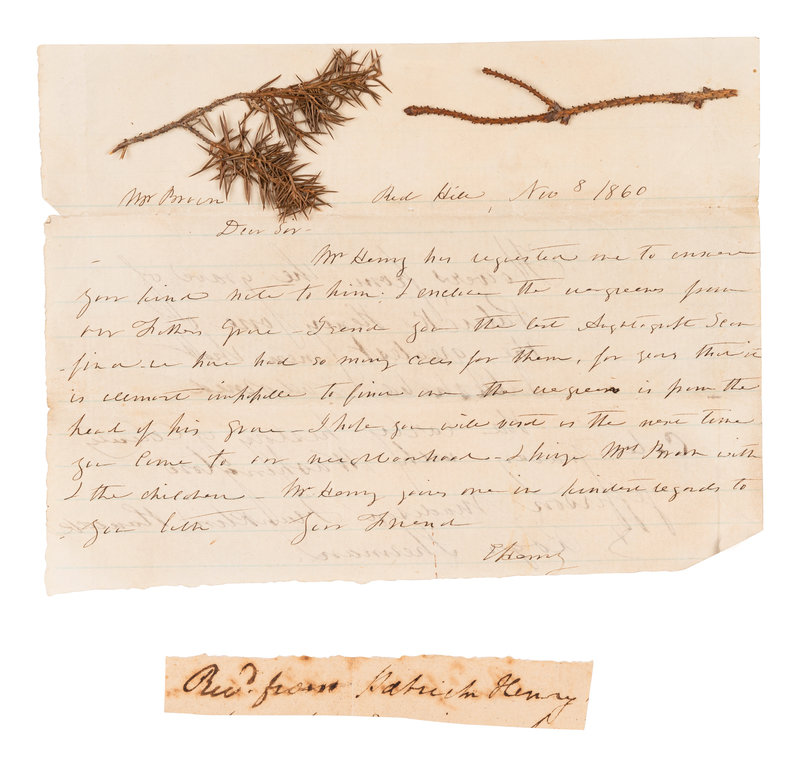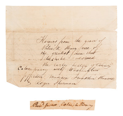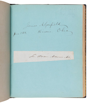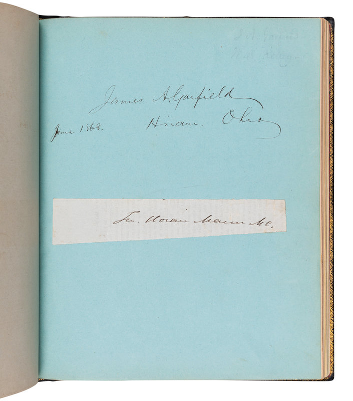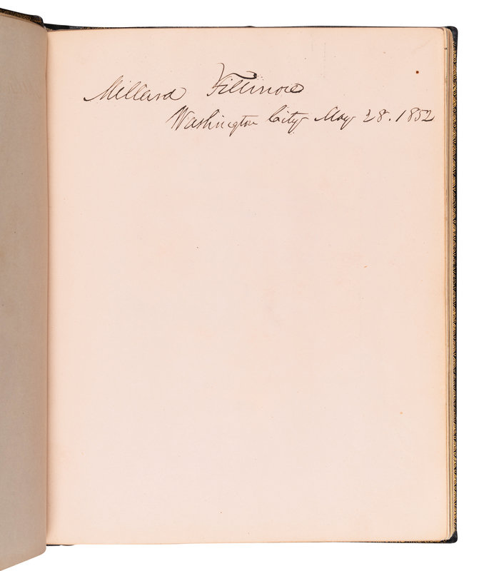 [FILLMORE, Millard (1800-1874) -- AUTOGRAPH ALBUM]. An autograph album, ca 1850s-1870s, assembling more than190 inscriptions, signatures, mounted signatures or letters by various American Presidents, statesmen, missionaries and prominent figures, including: James A. Garfield (inscription: “James A. Garfield / June 1868. Hiram, Ohio”), Millard Fillmore (inscription: “Millard Fillmore / Washington City May 28. 1852”), Daniel Webster (mounted inscription and letter), Henry Clay, William Seward (clipped signature), Jefferson Davis (clipped signature), Patrick Henry (clipped signature laid in loose, with a note containing dried flowers from his grave and related note), Henry Ward Beecher (inscription), Bayard Taylor (letter), Samuel F. B. Morse (inscription), Edwin E. Bliss, Hannibal Hamlin, and numerous others.