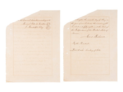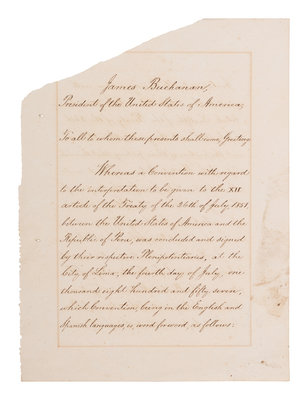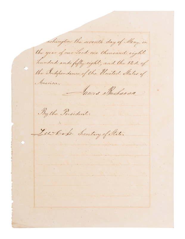 BUCHANAN, James (1791-1868). Manuscript document signed (“James Buchanan”) as President, countersigned by Secretary of State Lewis Cass. A contemporary bilingual copy of the ratification of interpretations to Article 12 of the original Treaty of the 26th of July 1851 between the United States and the Republic of Peru. 7 May 1858.