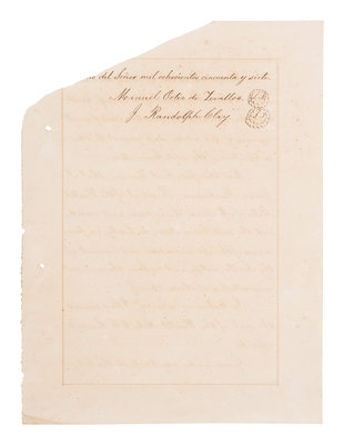 23 pages on 12 leaves, 343 x 255mm. Text in English and Spanish. Ruled in red throughout. Written in a secretarial hand in dark brown ink. (Upper lefthand corner of sheets torn away with some minor loss to some text, with previously bound edge a little rough from stitching, etc. [apparently removed from a bound volume], some soiling); slipcased.