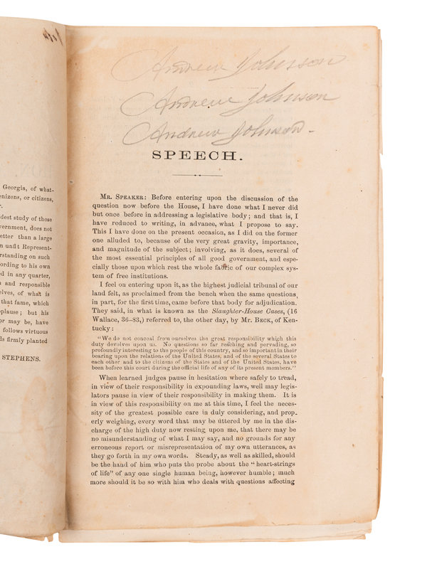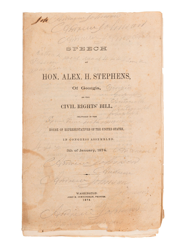 After the expiration of his presidential term, Johnson ran unsuccessfully for the Senate in 1869 and for the House in 1872 before being reelected to the Senate in 1874. While out of office, Johnson remained active in steering reconstruction past both former confederates and radical Republicans, so there is little wonder that he owned and read a speech on the Civil Rights Bill by the Vice President of Confederate States of America. Johnson has signed the title-page in full seven times and the recto of the first page of text three times. In addition, the final page is signed "Johnson" seven times and the title-page "Andrew" twice. The title-page also has a few unconnected autograph words and phrases ("Cotton is Passion"; "wool wool") and the final page a bit of ciphering. An interesting association item, linking two of the most important Southern politicians-one a Unionist, the other a secessionist-of the Civil War era. A VERY FINE ASSOCIATION COPY.