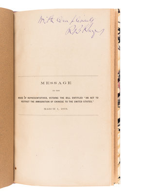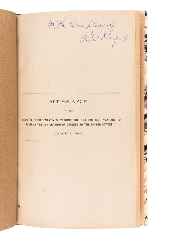 HAYES, Rutherford B. (1822-1893). Message to the House of Representatives, Vetoing the Bill entitled “An Act to Restrict the Immigration of Chinese to the United States.” March 1, 1879. [Washington, 1879].
