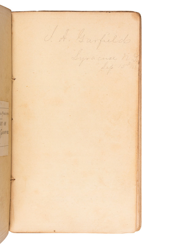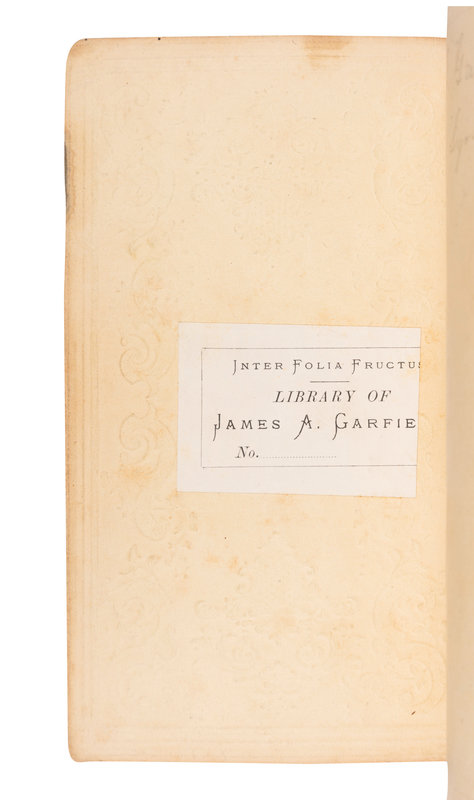Garfield’s library consisted of about 2,500 volumes, and this book contains his bookplate (cropped slightly) from his home, “Lawnfield” in Mentor, Ohio. The inscription likely dates from Garfield’s career as a schoolteacher from 1856-57. The final digit in the inscription is illegible (thumbed), but based on the subject of the work and the popular style in which it was written, it may have been used for his instructional purposes. The motto on his bookplate reads: “Inter Folia Fructu[s]. Library of James A. Garfield No…”. Books from Garfield’s library are scarce.