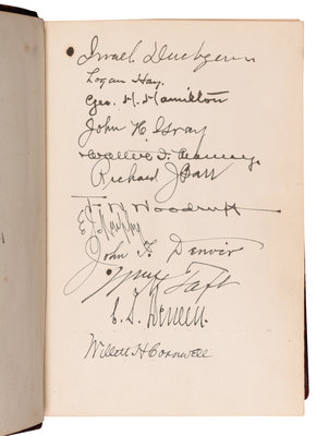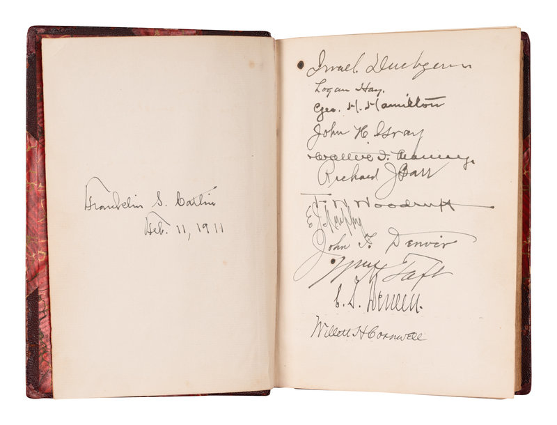 SIGNED BY TAFT (“Wm. H. Taft”) on front flyleaf. Additionally signed by twelve members of the Lincoln Centennial Association, including Governor Charles S. Deneen of Illinois, State Senator John T. Denvir. This volume was presented to the members and guests at the banquet given by the Association on the “One Hundred and Second Anniversary of Mr. Lincoln’s birth.”