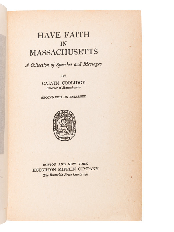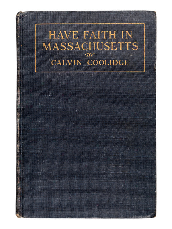 [With:] Have Faith in Massachusetts. Boston: Houghton-Mifflin Company, 1919. 8vo. Publisher's dark blue cloth gilt (rubbing, toning). Provenance: Elizabeth R. Walsh (presentation inscription). INSCRIBED TO ELIZABETH R. WALSH BY CALVIN COOLIDGE.