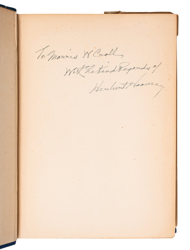FIRST EDITION, PRESENTATION COPY, INSCRIBED BY HOOVER on the front free endpaper: "To Morris W. Croll / With the kind Regards of / Herbert Hoover." More commonly found in publisher's red cloth.