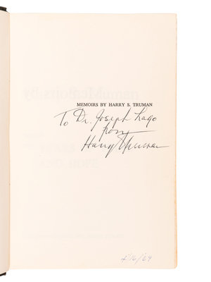 FIRST EDITIONS, PRESENTATION COPIES, BOTH VOLUMES INSCRIBED BY TRUMAN on the dedication page and half-title, respectively: “To Joseph Lago / from / Harry S. Truman”. With additional notation in an unidentified hand “4/16/69” at foot of inscribed pages (presumably the date of inscriptions). Also inscribed in an unidentified hand on dedication leaf of vol. II: “My regards to Dr. Joseph Lago”(possibly in Bess Truman’s hand).