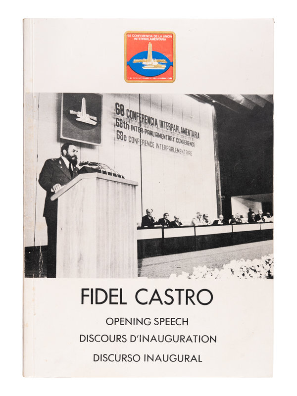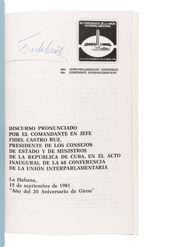 SIGNED BY CASTRO on the title-page of the Spanish language section of the booklet (white pages). Castro delivered this speech at the 68th Inter-Parliamentary Conference in Havana Cuba on September 15, 1981. His opening speech is presented here in three languages, each sectioned on a different colored paper, respectively.