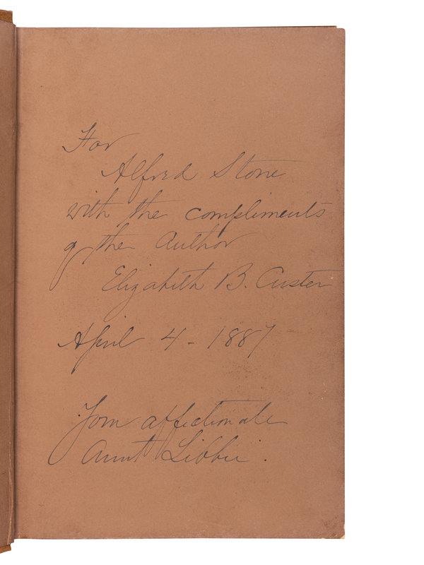 FIRST EDITION, second issue with portrait and map, PRESENTATION COPY, INSCRIBED BY ELIZABETH CUSTER TO HER NEPHEW on the front free endpaper: “For Alfred Stone / with the compliments of the Author / Elizabeth B. Custer / April 4 - 1887 / from affectionate Aunt Libbie.” Howes C-980.