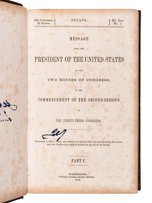 [DAVIS, Jefferson (1808-1889), his copy]. Message from the President of the United States to the Two Houses of Congress, at the Commencement of the Second Session of the Thirty-Third Congress, Part I. Washington: Beverley Tucker, Senate Printer, 1854.