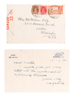 GANDHI, Mohandas K. (1869-1948). Autograph letter signed (“MK Gandhi”), to Mrs. McMillan Seely. Segaon, 15 February 1940.