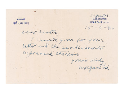 In full: “Dear Sister / I thank you for your letter and the sentiments expressed therein. / Yours sin’ly, / MK Gandhi.” The recipient of the letter is most likely Harriet McMillan Seely, granddaughter of Senator from Minnesota (1875-87), who like her mother Jessie McMillan Seely collected autographs. The Minnesota Historical Society holds the Ravi D. Goel collection of Samuel James Renwick McMillan family papers, 1818-1956.