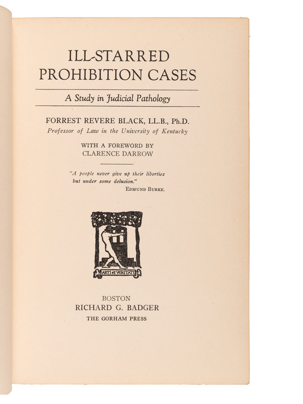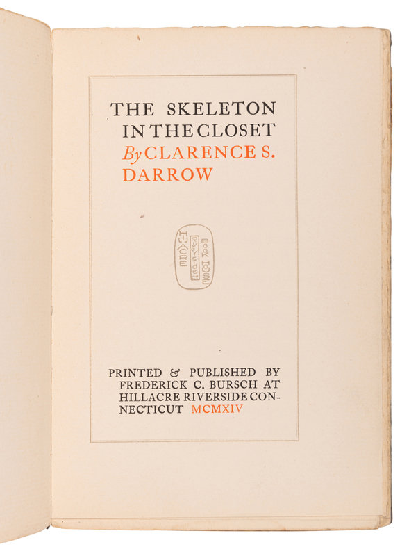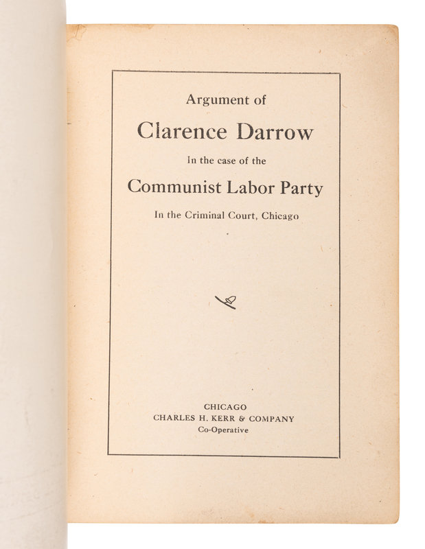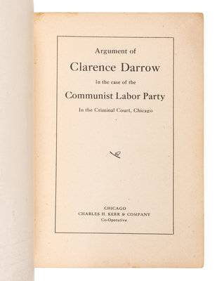 LIEB, Hermann. The Protective Tariff. What it Does for Us!. Chicago et al: Belford, Clarke & Co., 1888. PRESENTATION COPY, INSCRIBED BY LIEB. -- McINTOSH, William. Sermons from a Philistine Pulpit. East Aurora, NY: The Roycroft Shop, 1898. PRESENATION COPY INSCRIBED BY ELBERT HUBBARD. -- McGAFFEY, Ernest. Poems of the Town. Boston: Richard G. Badger, 1901. PRESENTATION COPY, INSCRIBED by McGaffey. -- SALT, Henry S. Cum Grano. Berkeley Heights, NJ: The Oriole Press, 1931. PRESENTATION COPY INSCRIBED by Joseph Ishill, typsetter for The Oriole Press. -- CALVERTON, V. F. The Passing of the Gods. New York: Charles Scribner's Sons, 1934. PRESENTATION COPY, INSCRIBED BY CALVERTON. -- DARROW. A Persian Pearl. East Aurora, NY: The Roycroft Shop, 1899. PRESENTATION INSCRIPTION FROM DARROW to Gertrude Bassier?. -- DARROW. The Skeleton in the Closet. Riverside, CT: Frederick C. Bursch, 1914. With Darrow's bookplate. -- DARROW. An Eye for an Eye. New York: Duffield & Co., 1920. PRESENTATION INSCRIPTION FROM DARROW to Fay Lenin. -- With 8 works in 9 volumes with Darrow's bookplate, with 18 works in 18 volumes by Darrow, and with 13 works in 15 volumes. Together, 47 works in 50 volumes, various sizes.