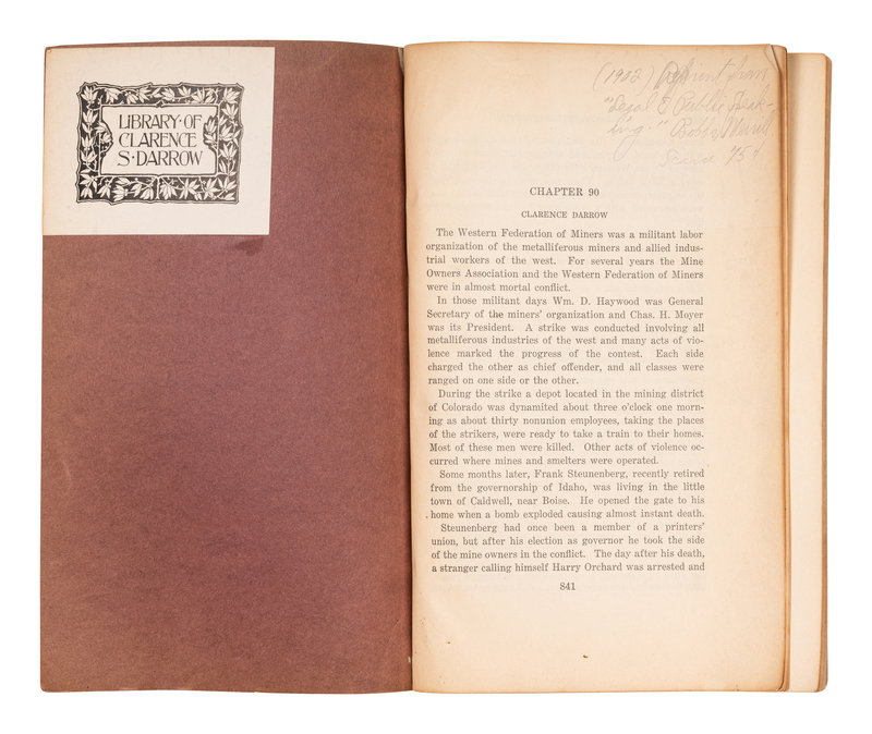 DARROW, Clarence (1857-1938). A collection of works from Darrow's library, some with presentation inscriptions, most with bookplates, and with several copies of his own works, including:
