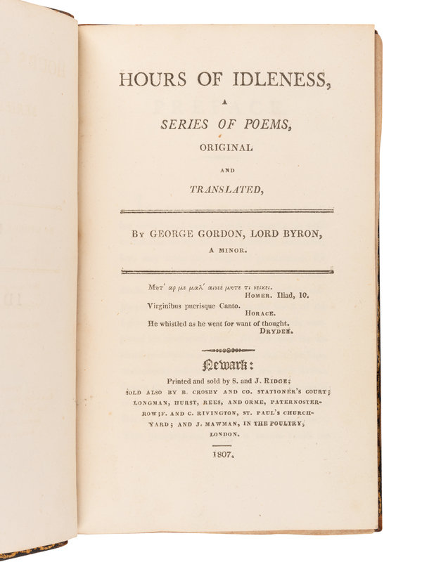BYRON, George Gordon Noel, Lord (1788-1824). Hours of Idleness. Newark: S. and J. Ridge, et al,1807.