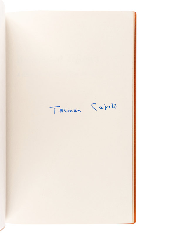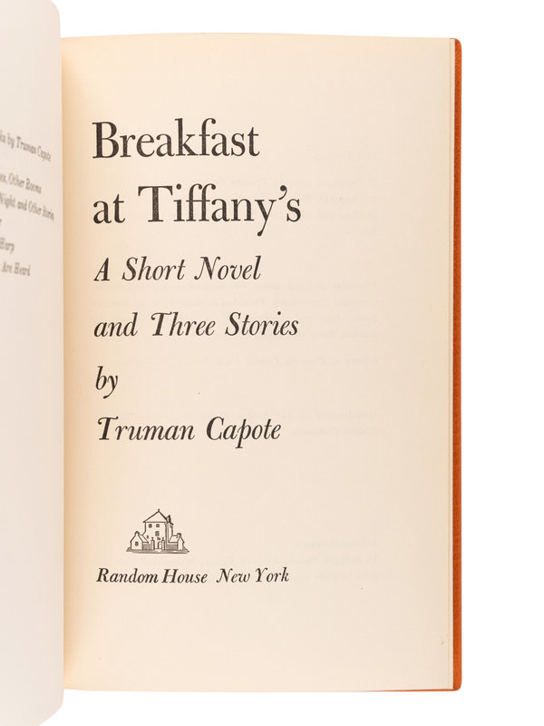 FIRST EDITION, FIRST ISSUE, SIGNED BY CAPOTE on the front blank leaf, with stated "First Printing" on copyright page. Capote's novella was published along with three other short stories: "House of Flowers," "A Diamond Guitar," and "A Christmas Memory." "Breakfast at Tiffany's" was adapted to film by George Axelrod in 1961, starring Audrey Hepburn in her most memorable role as Holly Golightly. The film was released on 5 October 1961 to critical and commercial success, grossing $14 million on a $2.5 million budget.