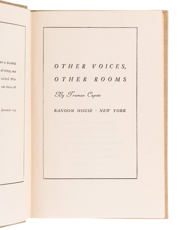 Music for Chameleons. 1980. -- The Dogs Bark Public People and Private Places. 1973. -- A Tree of Night and other Stories. 1949. FIRST ISSUE. -- Other Voices, Other Rooms. 1948. FIRST ISSUE. -- Together, 4 works in 4 volumes, all published in New York by Random House, all 8vo, all in original cloth, most with dust jackets, ALL FIRST EDITIONS, condition generally very good.