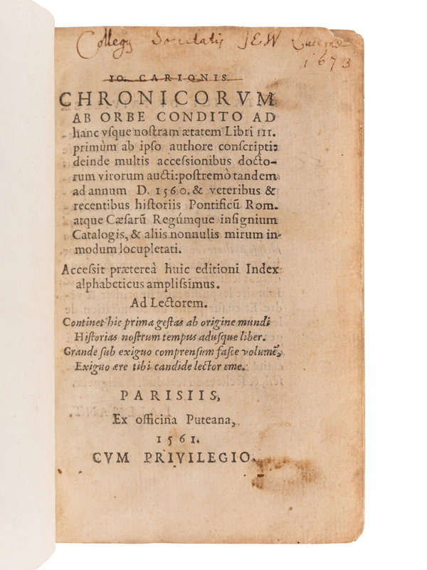 CARION, Johannes (1499-1537). Chronicorum ab orbe condition ad hane usque nostram aetatem Libri III... Paris: Puteana, 1561.