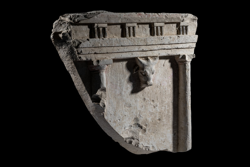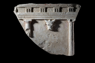 A Greco-Roman Limestone Fragment with Entablature and Bucranium