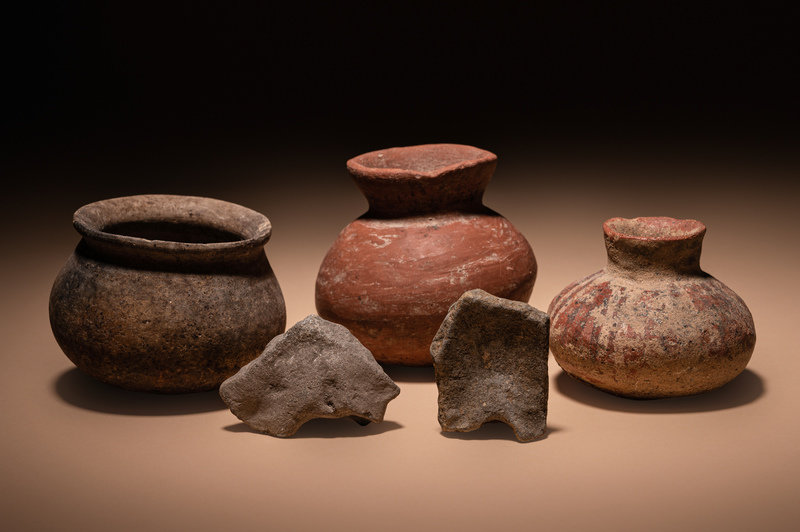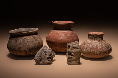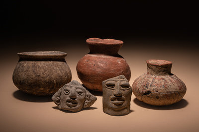 Three Pre-Columbian Terracotta Bowls and Two Face Fragments