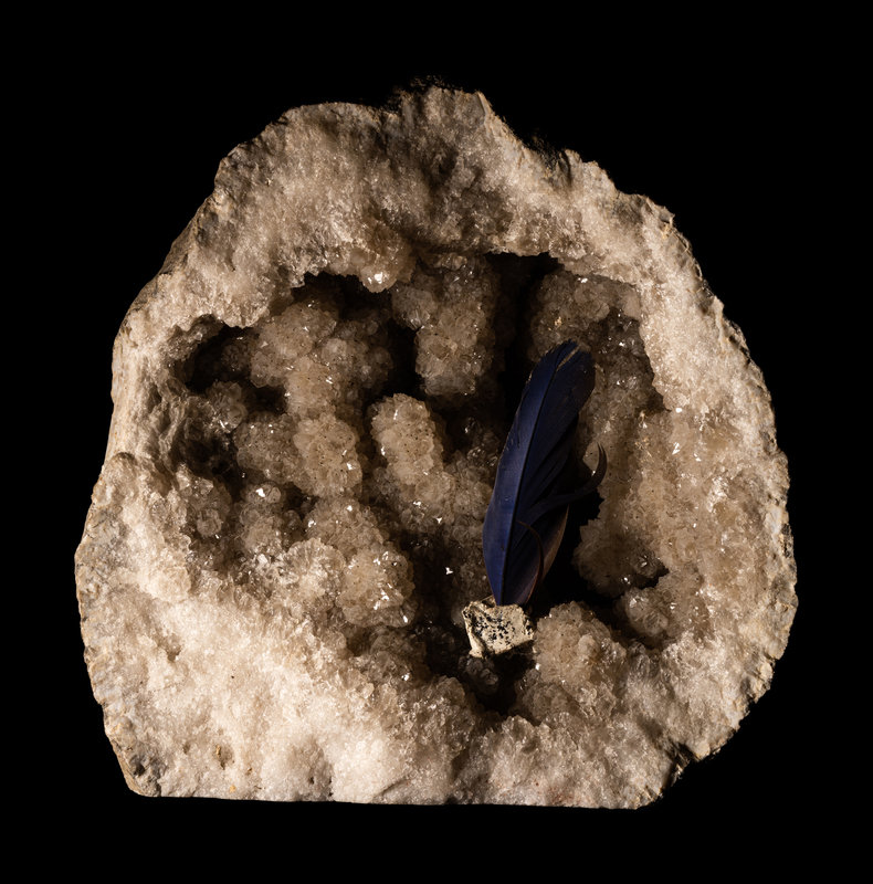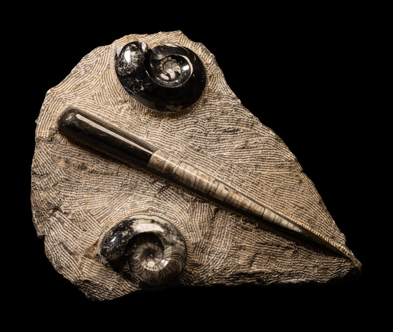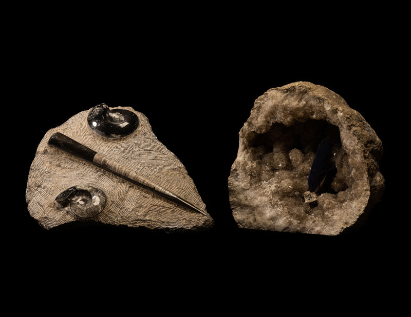 An Orthoceras and Ammonite Fossil Stone and Crystal Quartz Geode