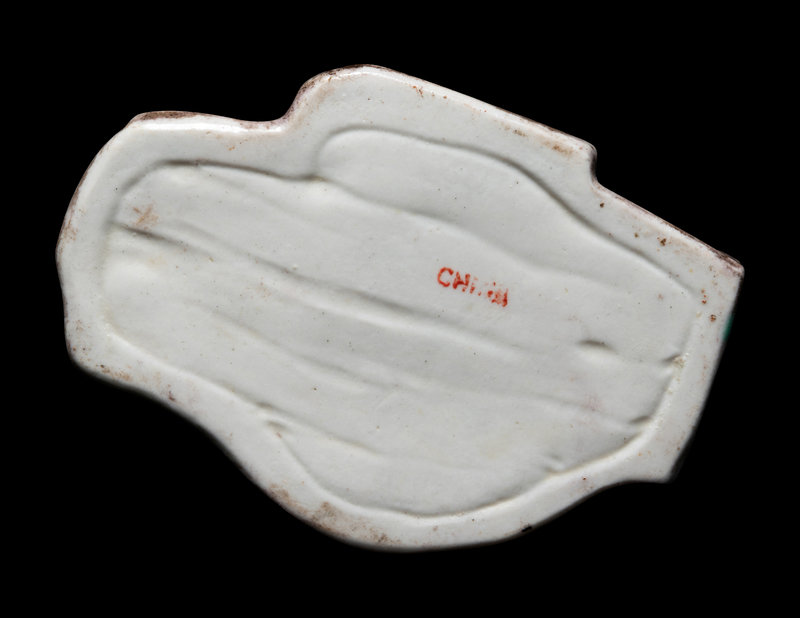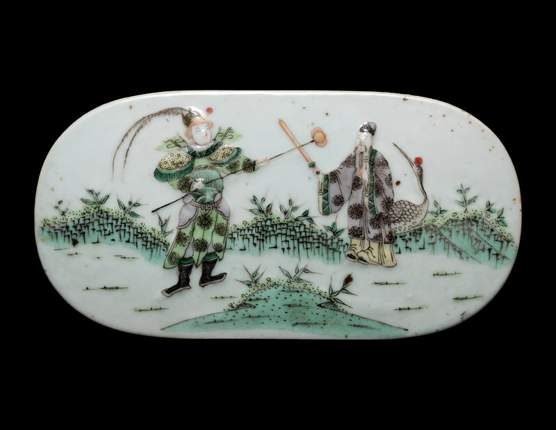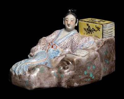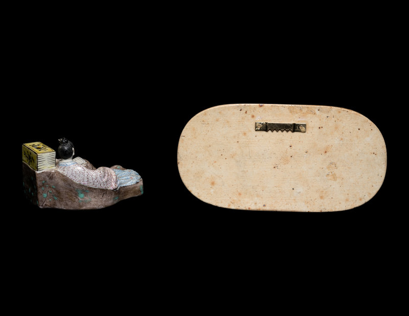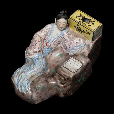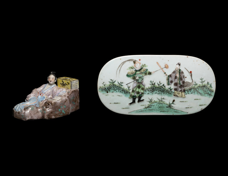 the first a water dropper molded as a lady reading poems, the second a plaque of oval shape, painted with two figures.