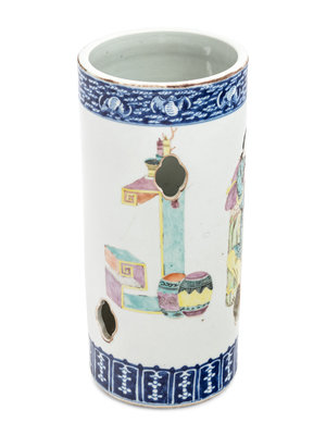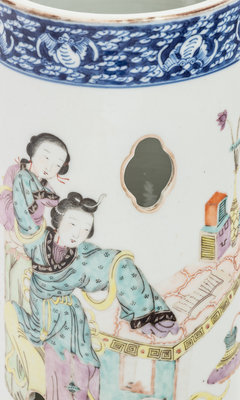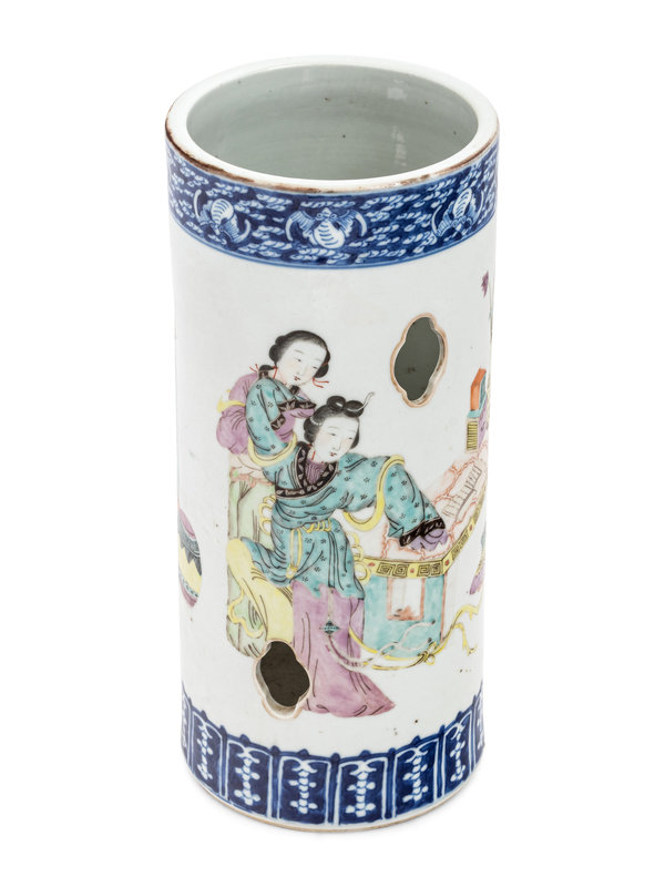 the cylindrical body decorated with quatrefoil-form openings, painted to the exterior with ladies and attendants, all between a band of bats amongst clouds and a row of lappet leaves in underglazed blue.