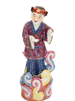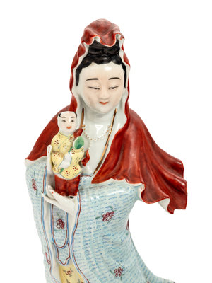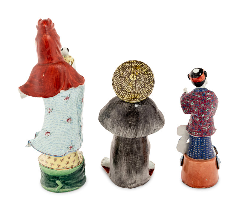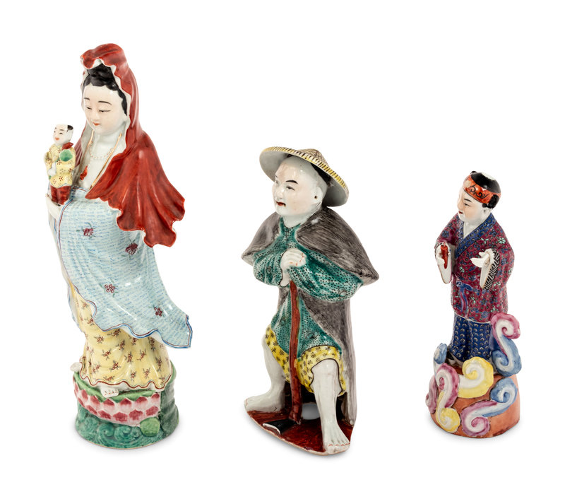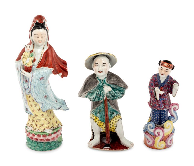 the first depicting Guanyin carrying a boy, the second a boy immortal above auspicious clouds and the third a fisherman.