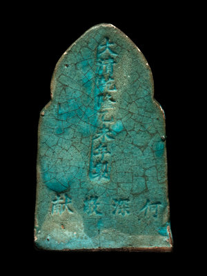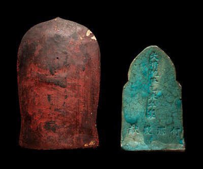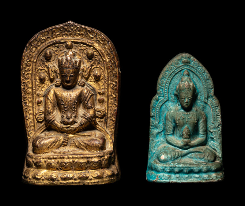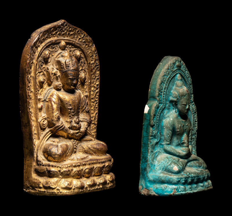 the first a gilt lacquered wood example, the second a turquoise glazed pottery example, both depicted Buddha seated on a double lotus plinth, backed by flaming mandala.