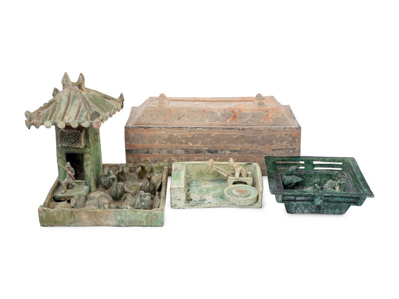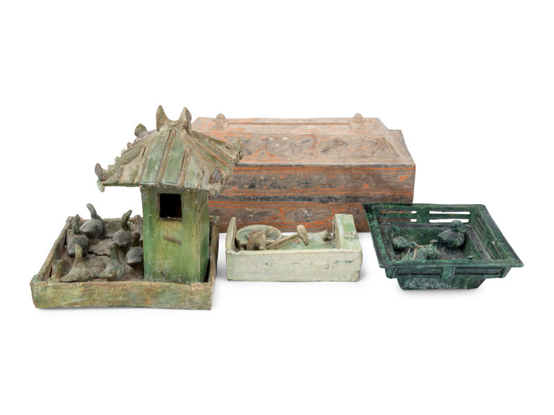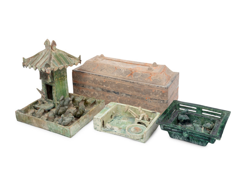 Three Chinese Green-Glazed Pottery Models and A Chinese Pottery Rectangular Cosmetic Box