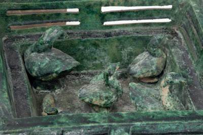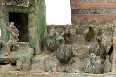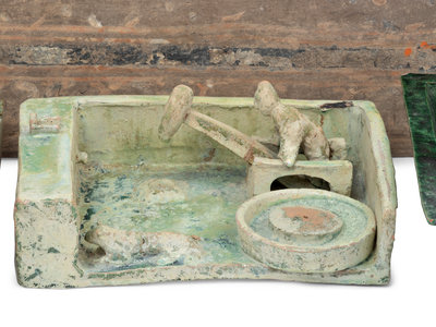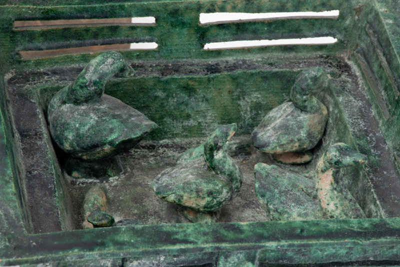 comprising of an architectural model of a duck pen and watch tower with several birds, ducks, turtles and fishes, a model of a duck pond in a darker green glaze, and a model of a rice huller and window on a rectangular base with three sides on a rising wall. The cosmetic box is completely covered by the decorated cover in orange-red and black pigments, the top is surmounted by four bosses between a lower rectangular band.
