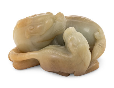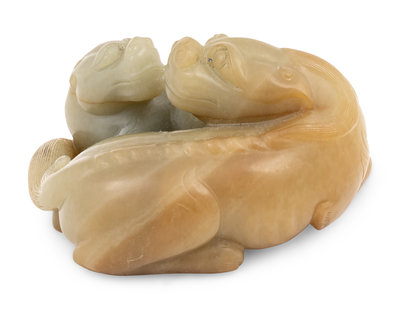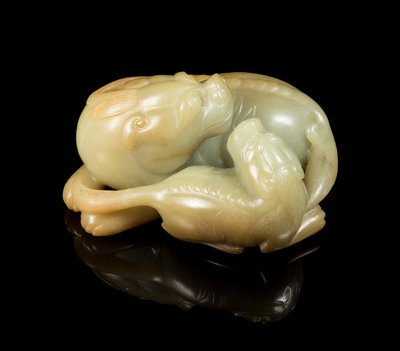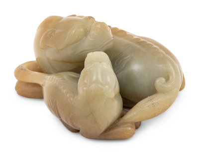 A Chinese Celadon and Russet Jade Carving of Two Mythical Beasts