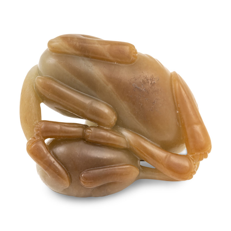 each with four legs folded under the curled body and head looking back over its haunches, the stone of celadon color with scattered russet inclusions.