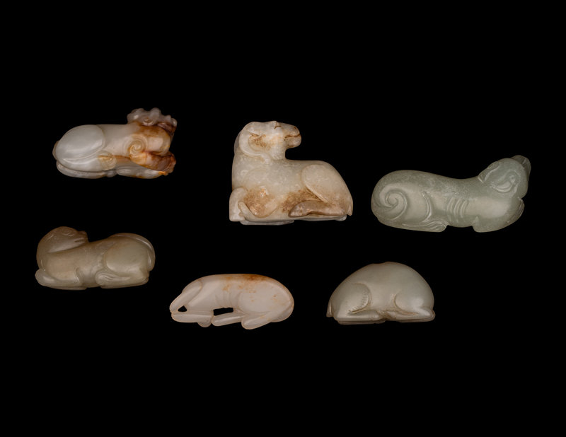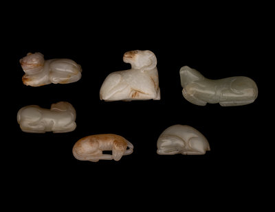 Six Chinese Carved Celadon Jade Figures of Recumbent Animals