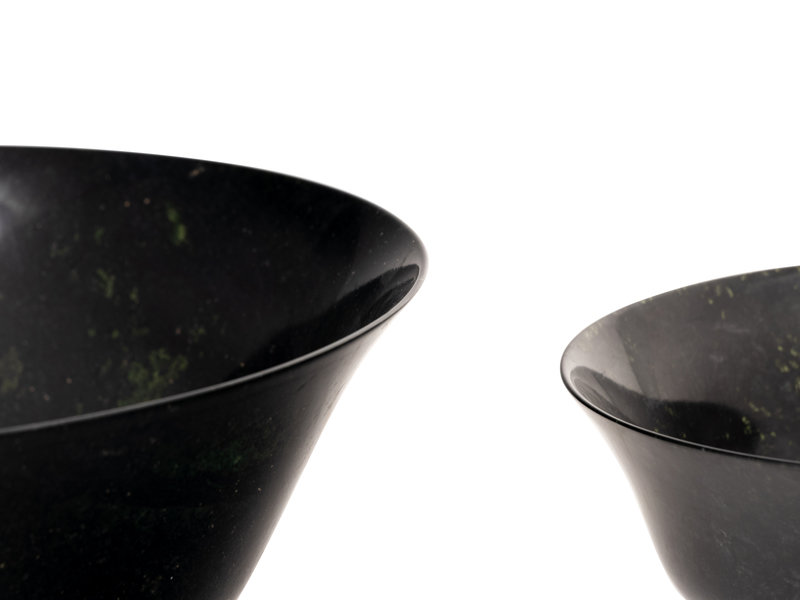 each bowl with deep, rounded walls rising to a flared mouth, the covered box of cylindrical form.