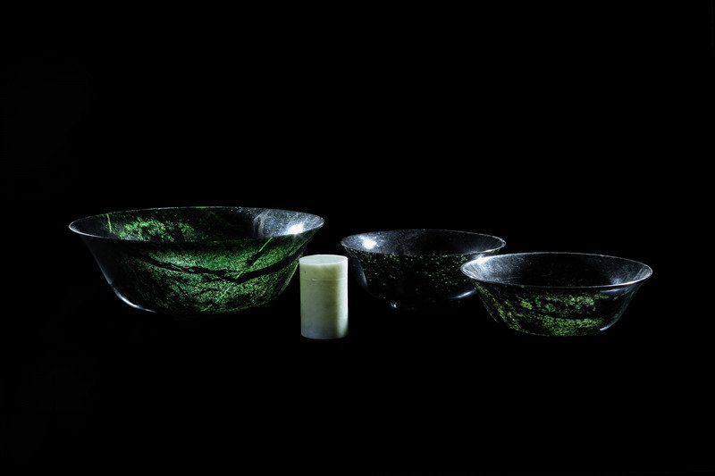 Three Chinese Spinach Jade Bowls and A Celadon Hardstone Covered Box