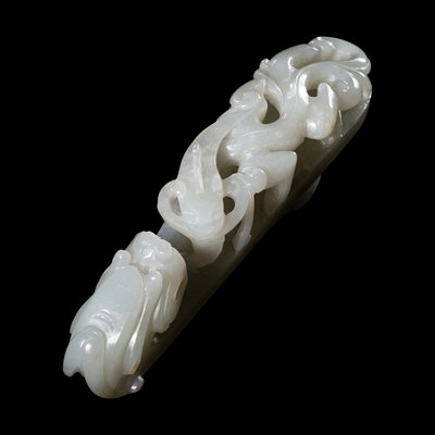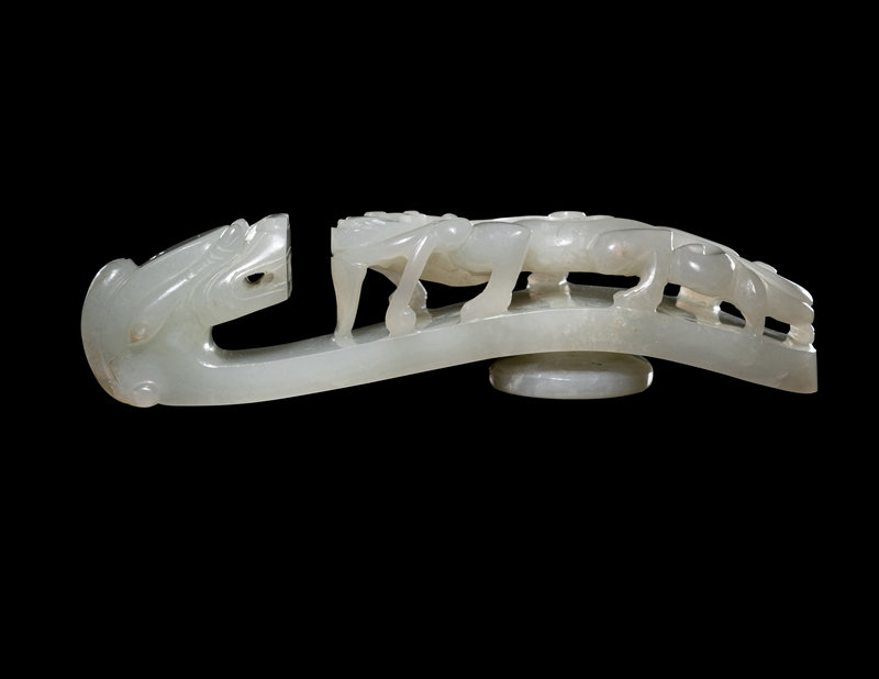 of an even colored stone with light inclusions, the hook in the form of a dragon head, the shaft carved in relief with a climbing chilong.