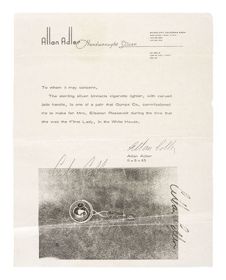 supported by a gimbal frame and marked S. & G. Gump / Sterling to underside, accompanied by a supporting document signed by Allan Adler attesting that the lighter is one of a pair that Gumps Co. commissioned me to make for Mrs. Eleanor Roosevelt during the time that she was the First Lady, in the White House.