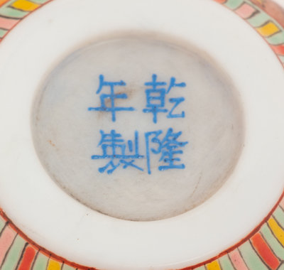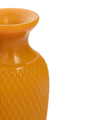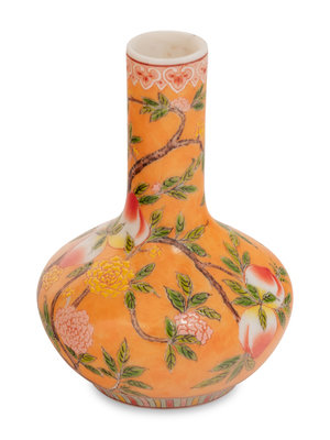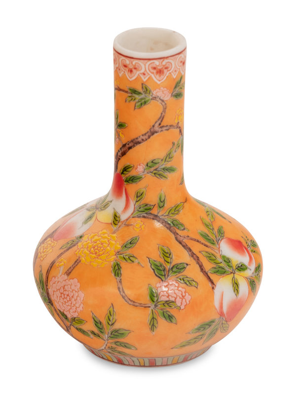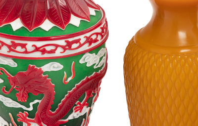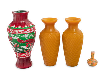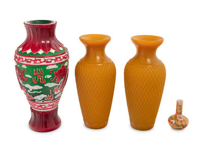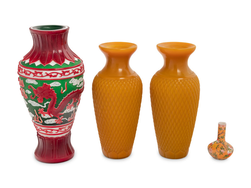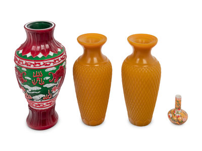 comprising a pair of yellow examples with a basketwearve pattern, a red and white overlay green ground example carved with dragons chasing flaming pearl amongst clouds, a yellow ground enameled bottle-form example.