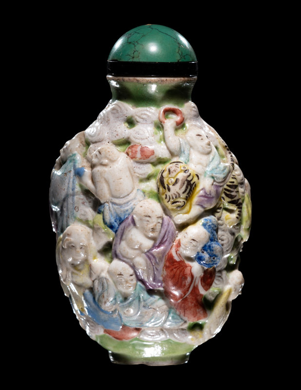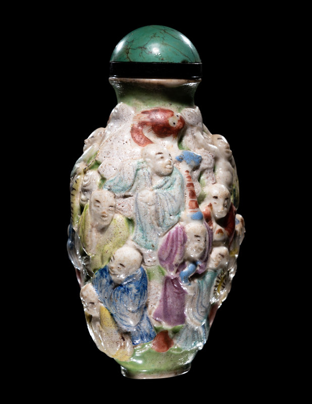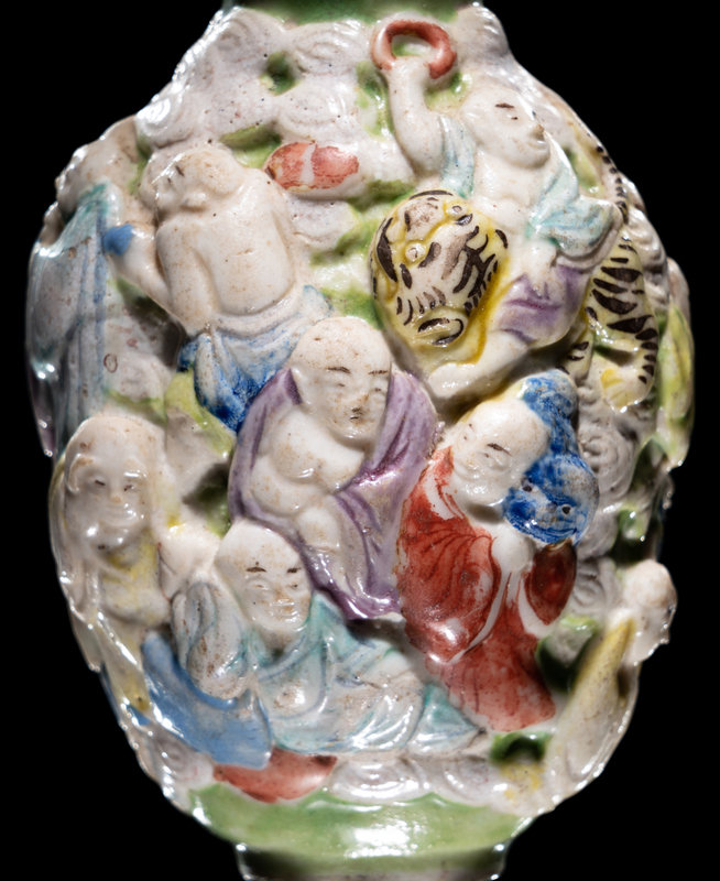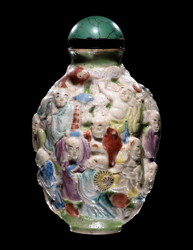 the ovoid bottle molded to the exterior with eighteen luohan and their attributes densely organized against a ground of cloud scrolls.